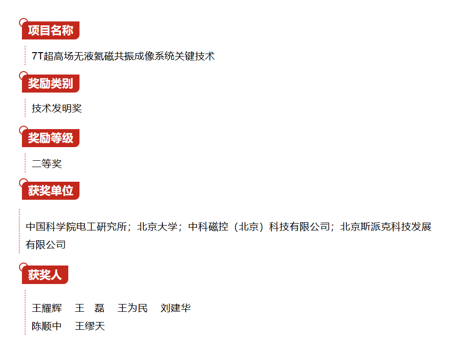 2025年12月7日,北京 —— 近日,2024年度中国电工技术学会科学技术奖获奖项目正式揭晓。由中国科学院电工研究所、北京大学、中科磁控(北京)科技有限公司及北京斯派克科技发展有限公司联合完成的“7T超高场无液氦磁共振成像系统关键技术”项目,荣获技术发明奖二等奖。这一权威奖项不仅标志着我国在高端无液氦科学仪器领域取得重大技术突破,也充分体现了以斯派克科技为代表的创新型企业在关键核心技术攻关与产学研协同中的重要作用。